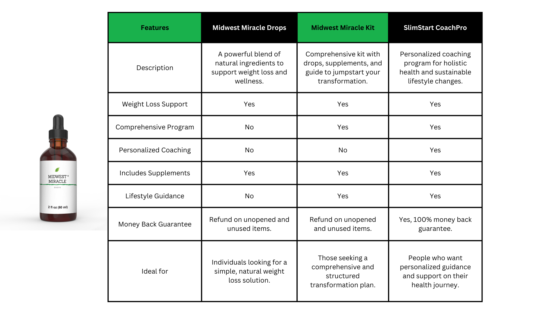 Join TodayThe Midwest Miracle Kit is a comprehensive program designed to jumpstart your health and wellness journey. It includes the powerful Midwest Miracle Drops, a tape measure to track your progress, a digital quick start guide, and a collection of delicious and healthy recipes. The Midwest Miracle Drops are specially formulated to help support your weight management goals and boost your overall well-being.