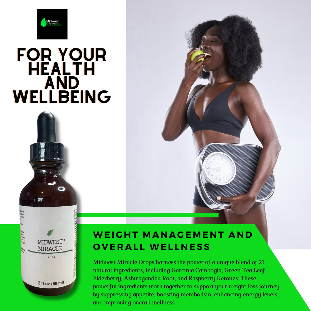 Our flagship product, the Midwest Miracle Drops, is a powerful blend of natural ingredients designed to support healthy weight management and boost vitality. Formulated with precision, these drops work synergistically with your body to aid in fat-burning and promote a balanced metabolism